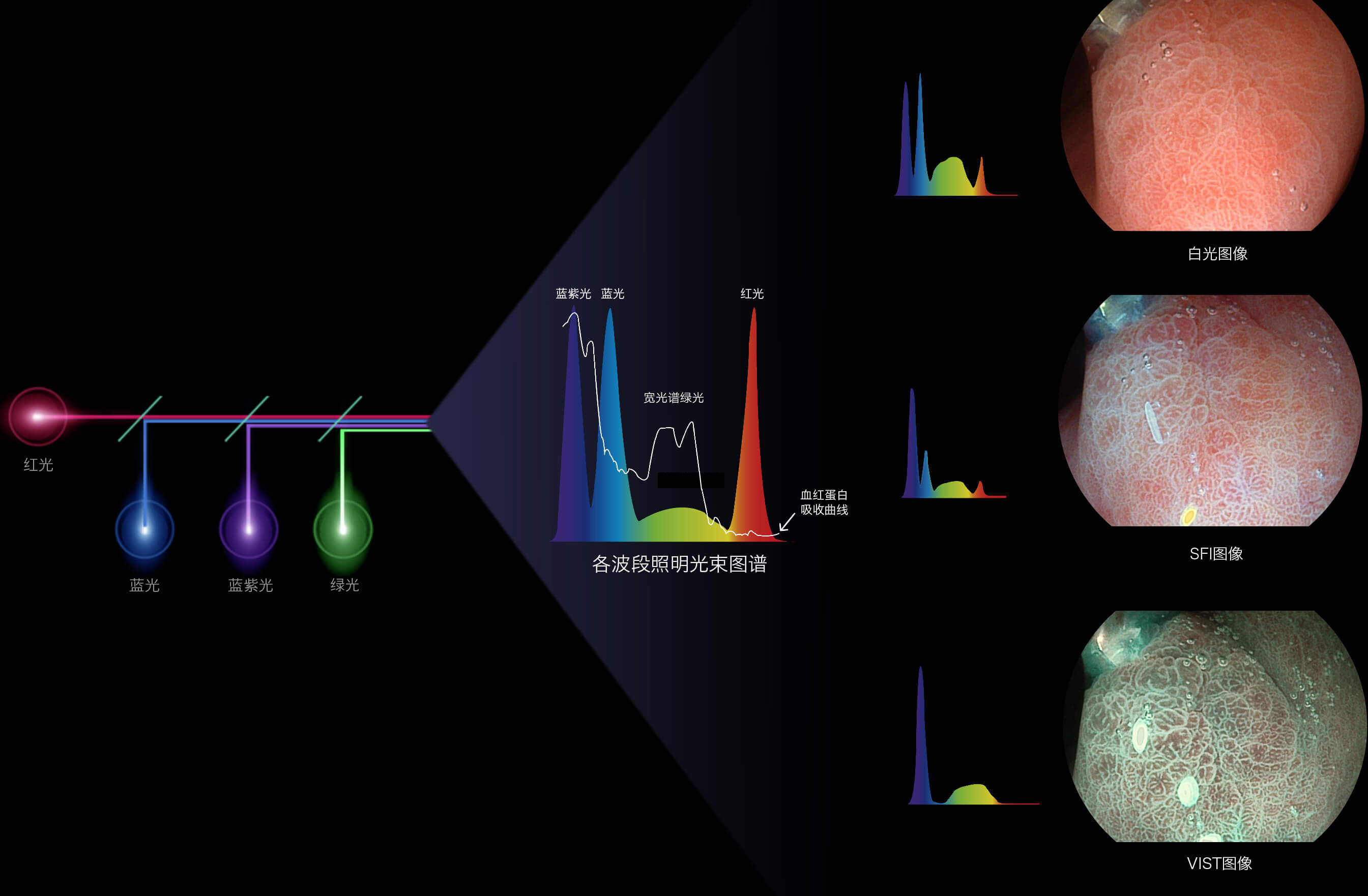 与上一代VIST相比,摒弃了滤光转轮而直接采用光谱组合的方案,加入了血红蛋白吸收高峰与次高峰的蓝紫光和绿光光谱,更有利于黏膜血管吸收,突显浅表层血管和中层血管的对比度,因而具备更高的图像对比度,近景观察时,有助于微细结构变化及病灶边界的观察。