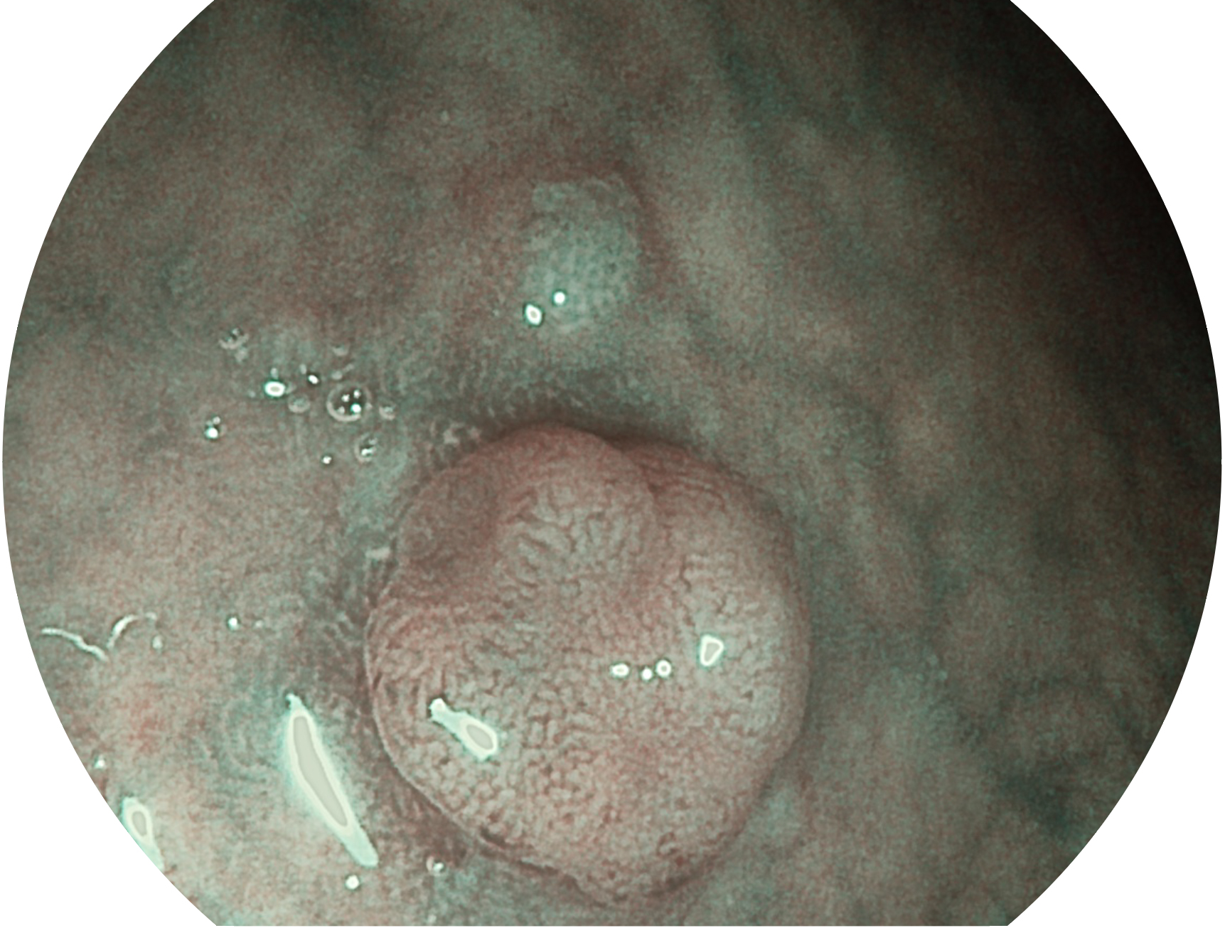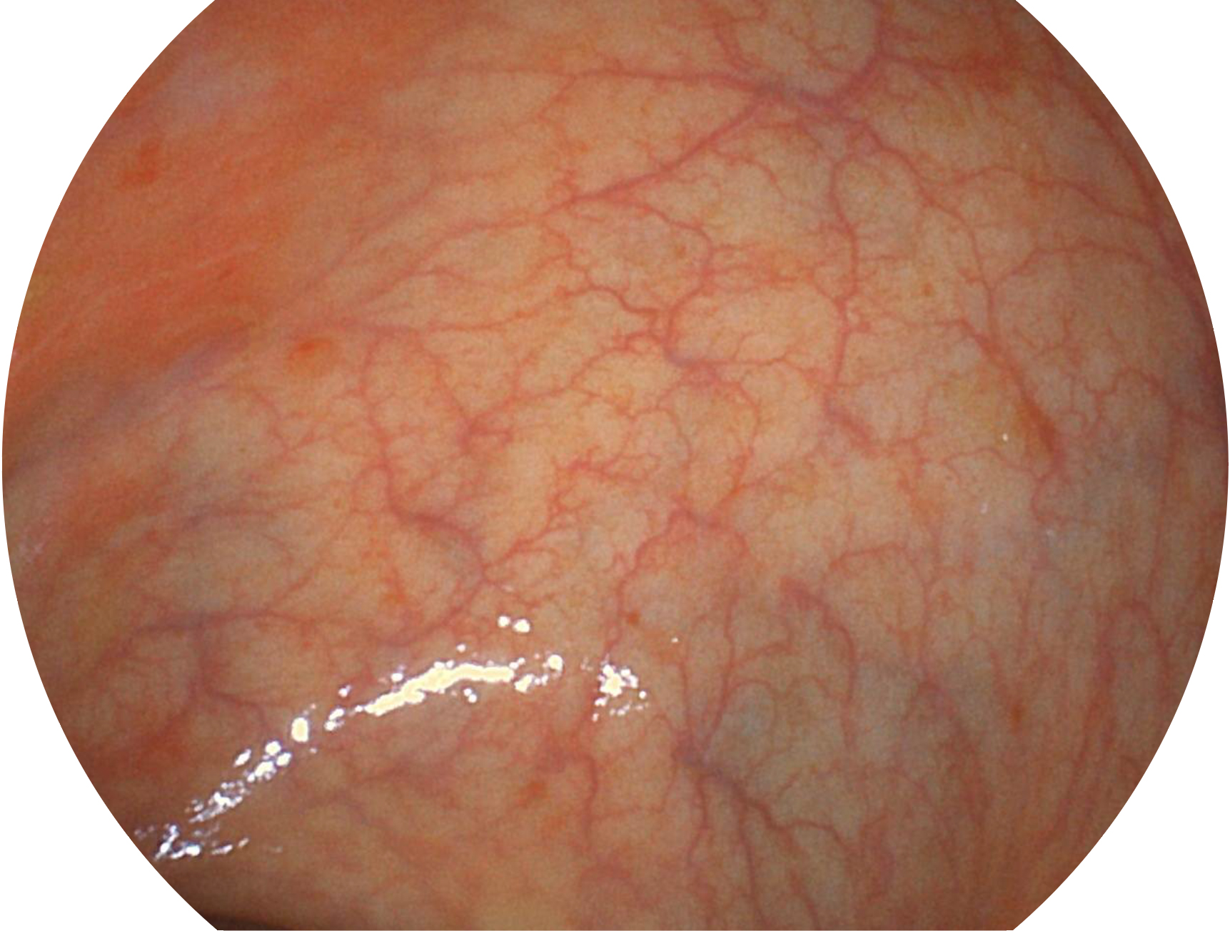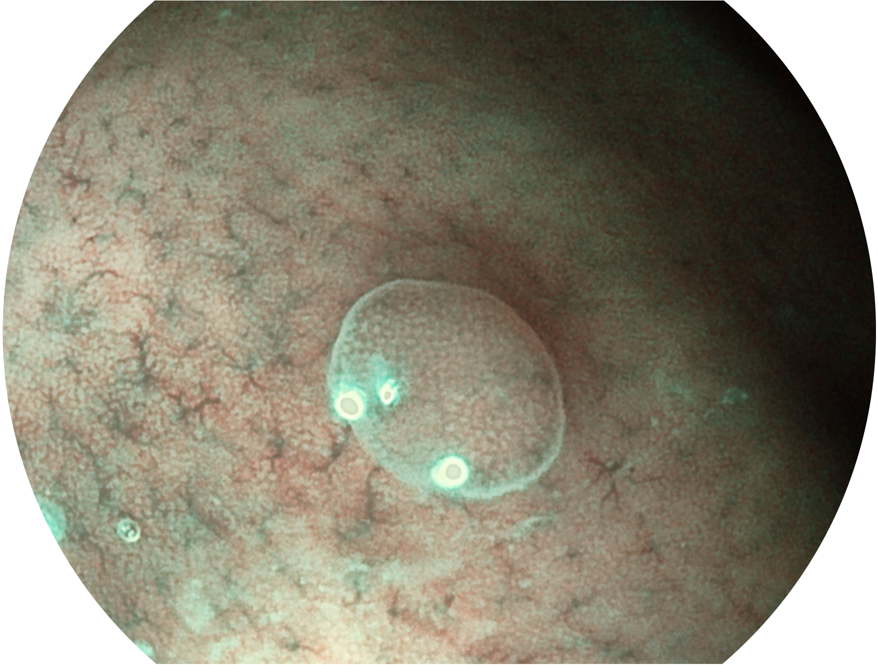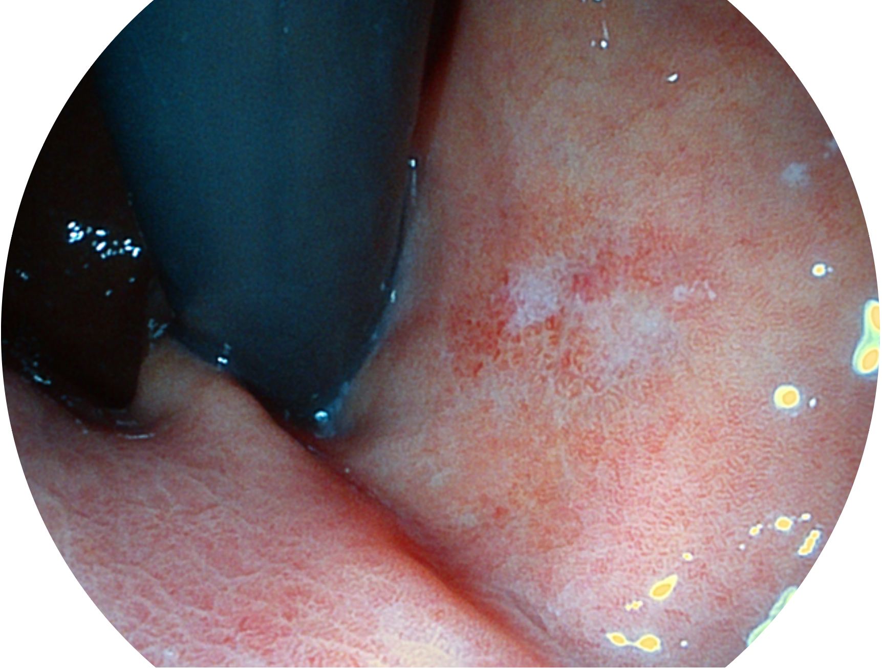 SFI技术是结合特定光谱照明与数字光谱滤波,实现高亮度特殊光成像。染色模式下,不改变粘液、食物残渣、粪液等基本颜色,在保持与白光照明相似的图像色调的同时突显了图像颜色的红白对比度,且在远距离观察的情况下具备与普通白光模式相同的图像亮度,有助于消化道疾病的大范围扫查和早癌筛查。