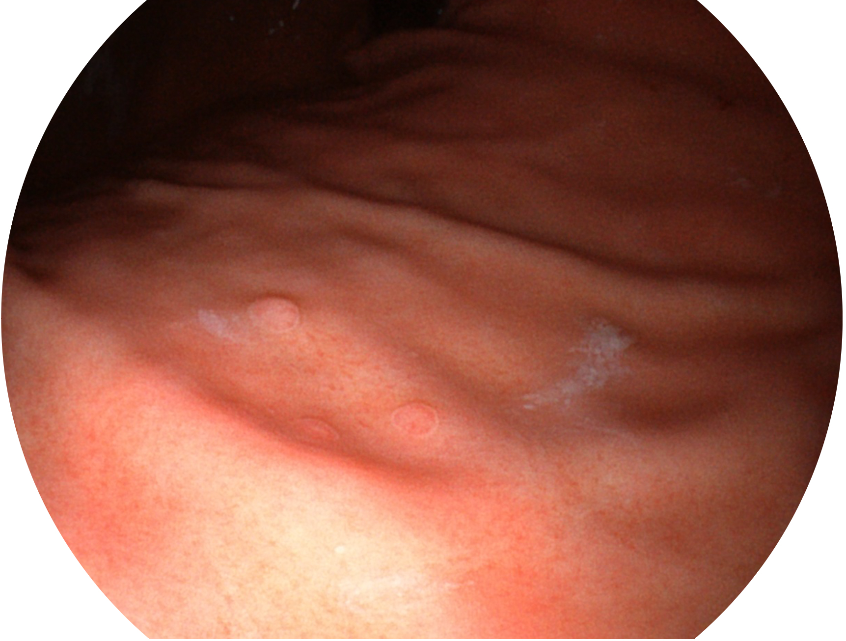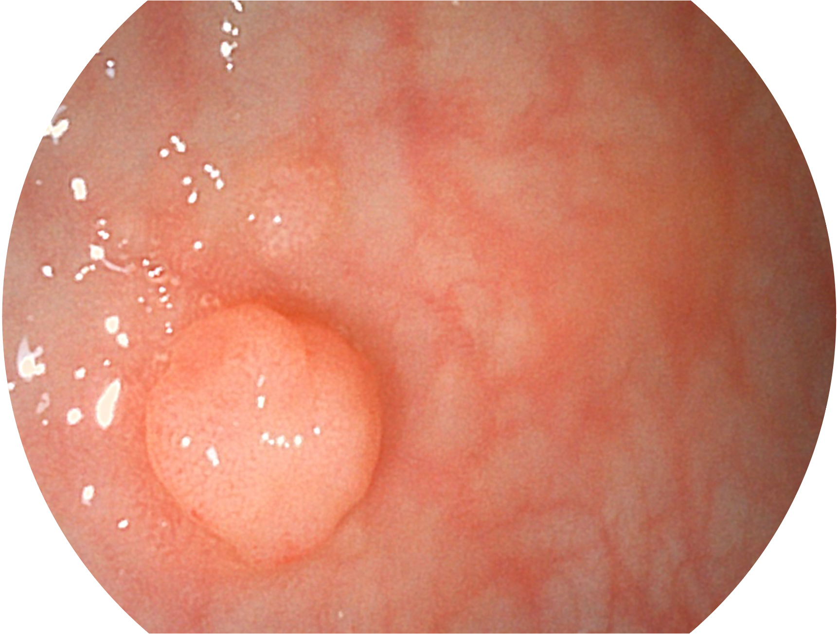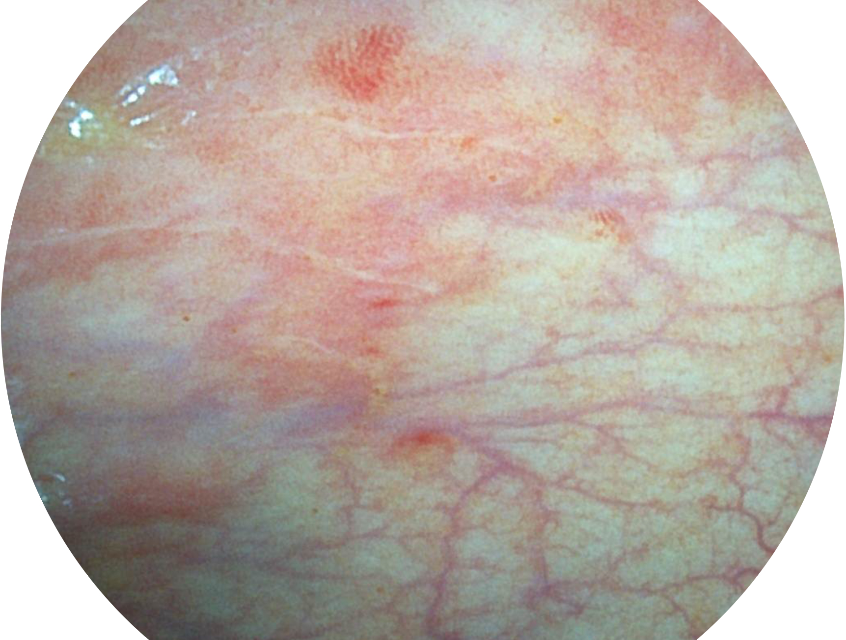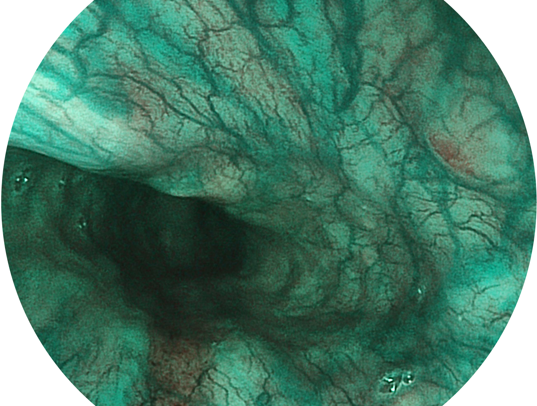 SFI技术是结合特定光谱照明与数字光谱滤波,实现高亮度特殊光成像。染色模式下,不改变粘液、食物残渣、粪液等基本颜色,在保持与白光照明相似的图像色调的同时突显了图像颜色的红白对比度,且在远距离观察的情况下具备与普通白光模式相同的图像亮度,有助于消化道疾病的大范围扫查和早癌筛查。