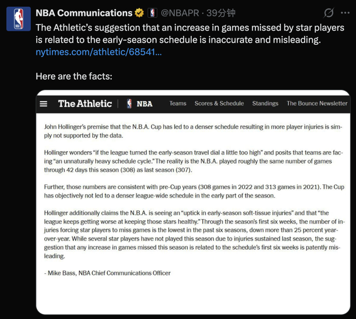 美媒The Athletic记者John Hollinger此前曾撰写长文,表示了对联盟的赛程安排不满,认为许多明星球员遭遇伤病,这与比赛场次增加与赛季初赛程安排有关。John Hollinger的长文受到NBA官方关注,并且进行了公开回应。
